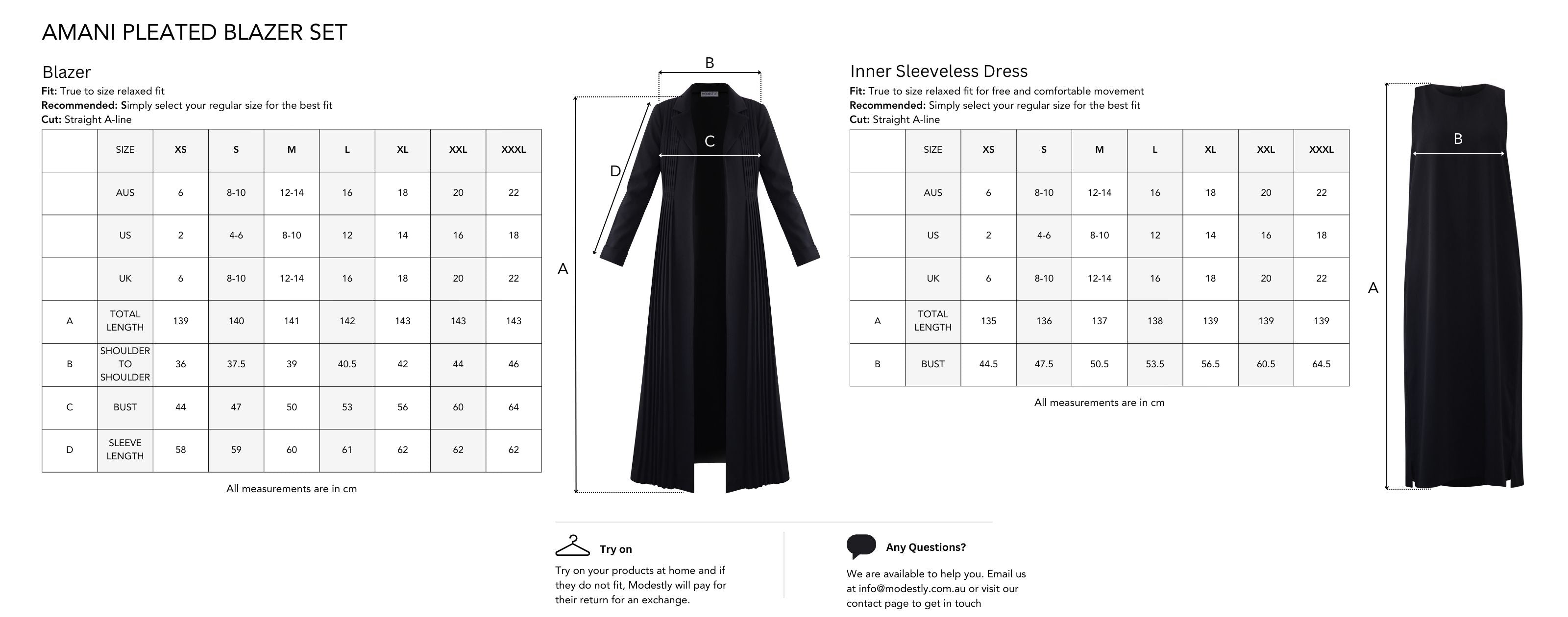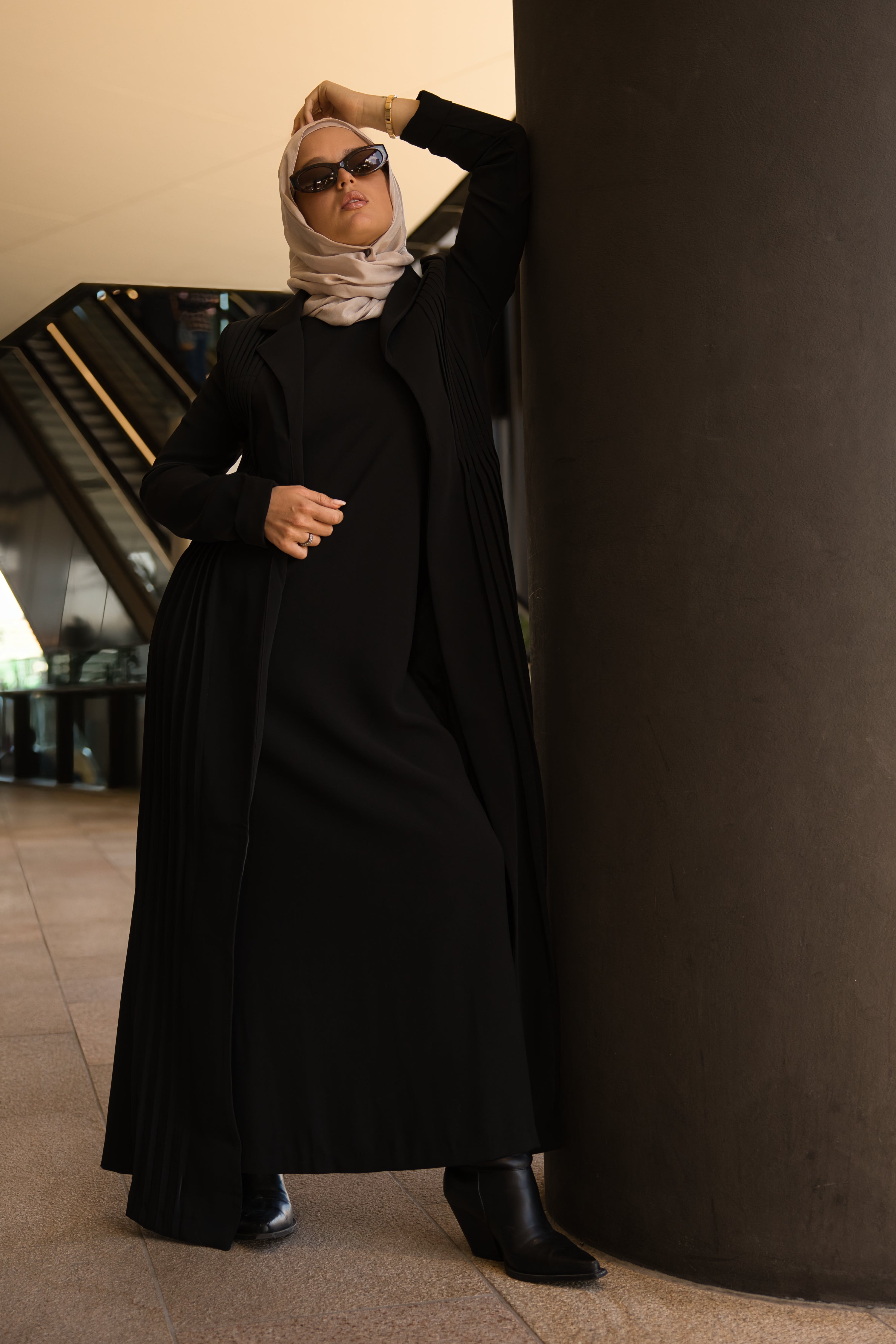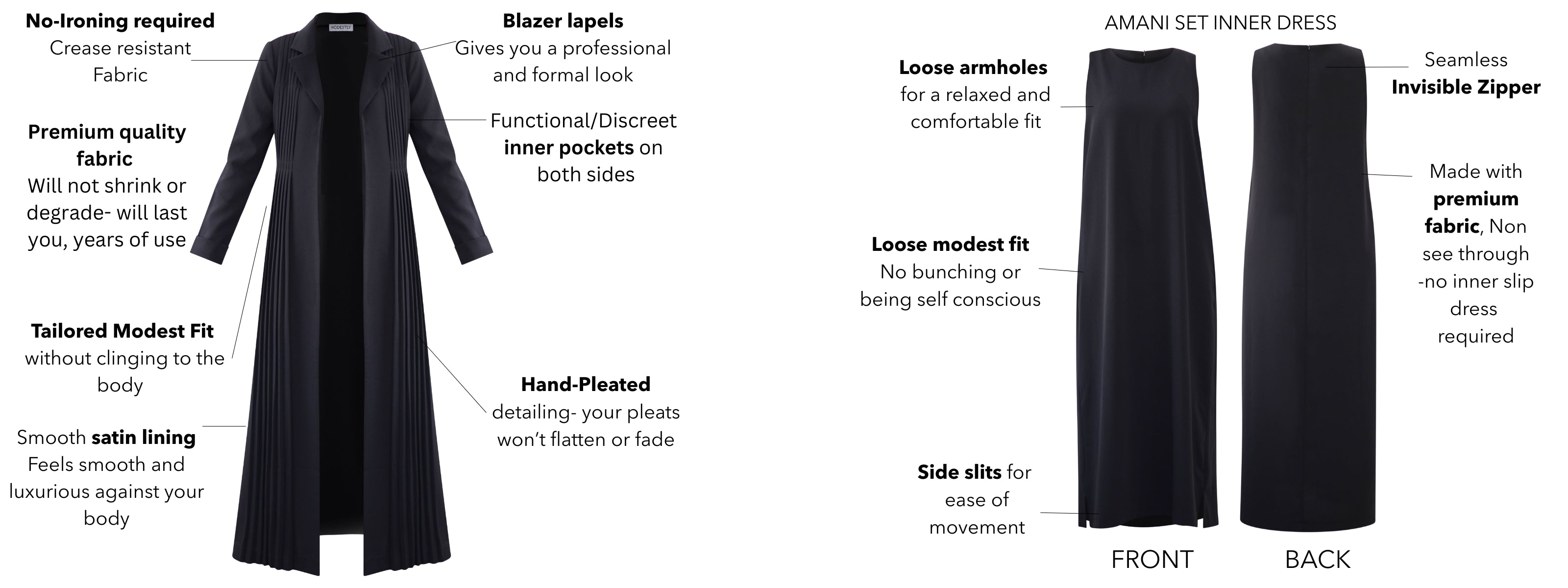 Step into elegance with the Amani Pleated Blazer Set, designed for a polished, modest look without compromising on comfort. Made from premium non-creasing crepe fabric with a soft satin lining, it drapes beautifully while offering all-day ease. The tailored blazer features hand-pleated details and inside pockets, while the sleeveless inner dress ensures free movement with a discreet back zipper for easy wear. Perfect for the corporate office and formal events