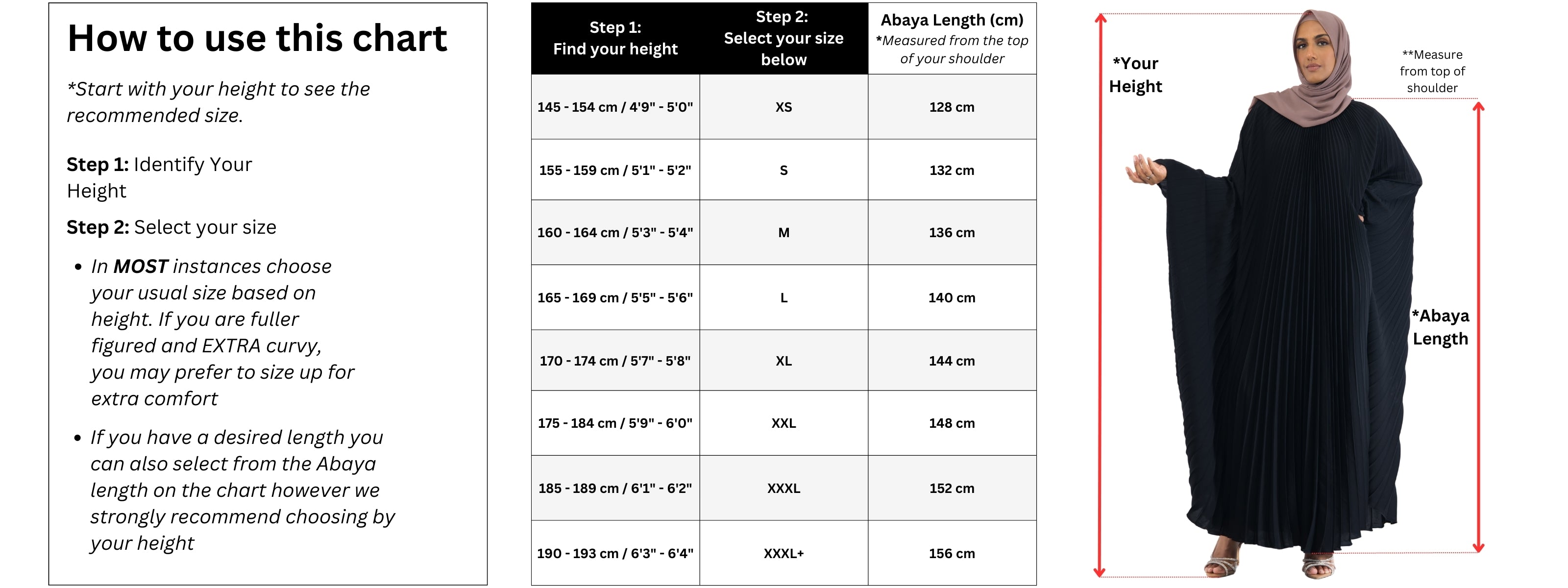 Refer to our size guide, which includes both height and body type recommendations. Our abayas are tailored for a range of heights and sizes, whether you’re petite or tall. We recommend choosing your size based on height in most cases. If you need further help, our customer service team is just a message away!